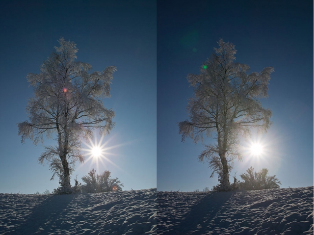 If you forget slight difference in exposure, you can see, that Canon is warmer than Leica, and star-bursts on Leica looks nice and sharp, while Canon produces star-bursts with rays that spread towards their ends. It also looks like Leica have less barrel distortion than Canon. I was pleasantly surprised last week, when even the sun sowed itself after a snow shower. Here are two photos taken few seconds apart.
